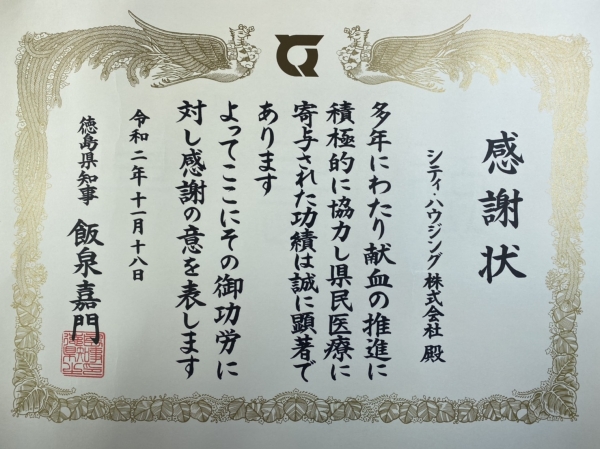徳島県より献血功労の感謝状受領